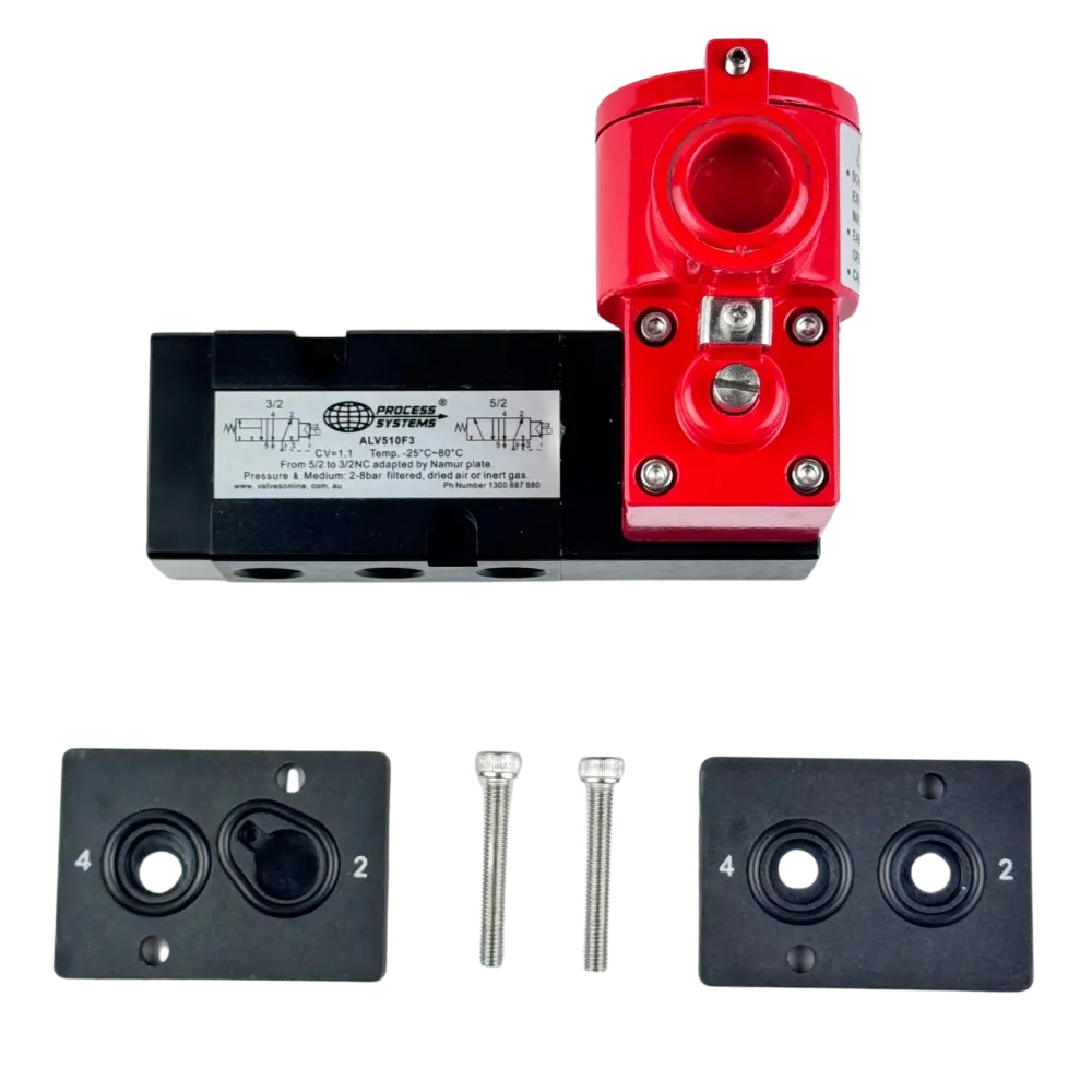 Our 5 way 2 position exd approved namur solenoid valve is suitable for hazardous areas where pneumatic actuators need a namur solenoid valve to operate. Can be adapted from 5/2 to 3/2 if needed however we recommend using the 5/2 configuration even for spring return actuators. Available in mono stable (solenoid/spring) and bi stable (solenoid/solenoid) configurations. Threads conform to ISO 7.1 Sealing Threads. IECEx Cert No. IECEx CQM 12.0022X (Ex d II C T6 Gb), NEPSI Cert No. GYB17.1935X (Ex d II C T6 Gb; Ex tD A21 IP6X T85°C).