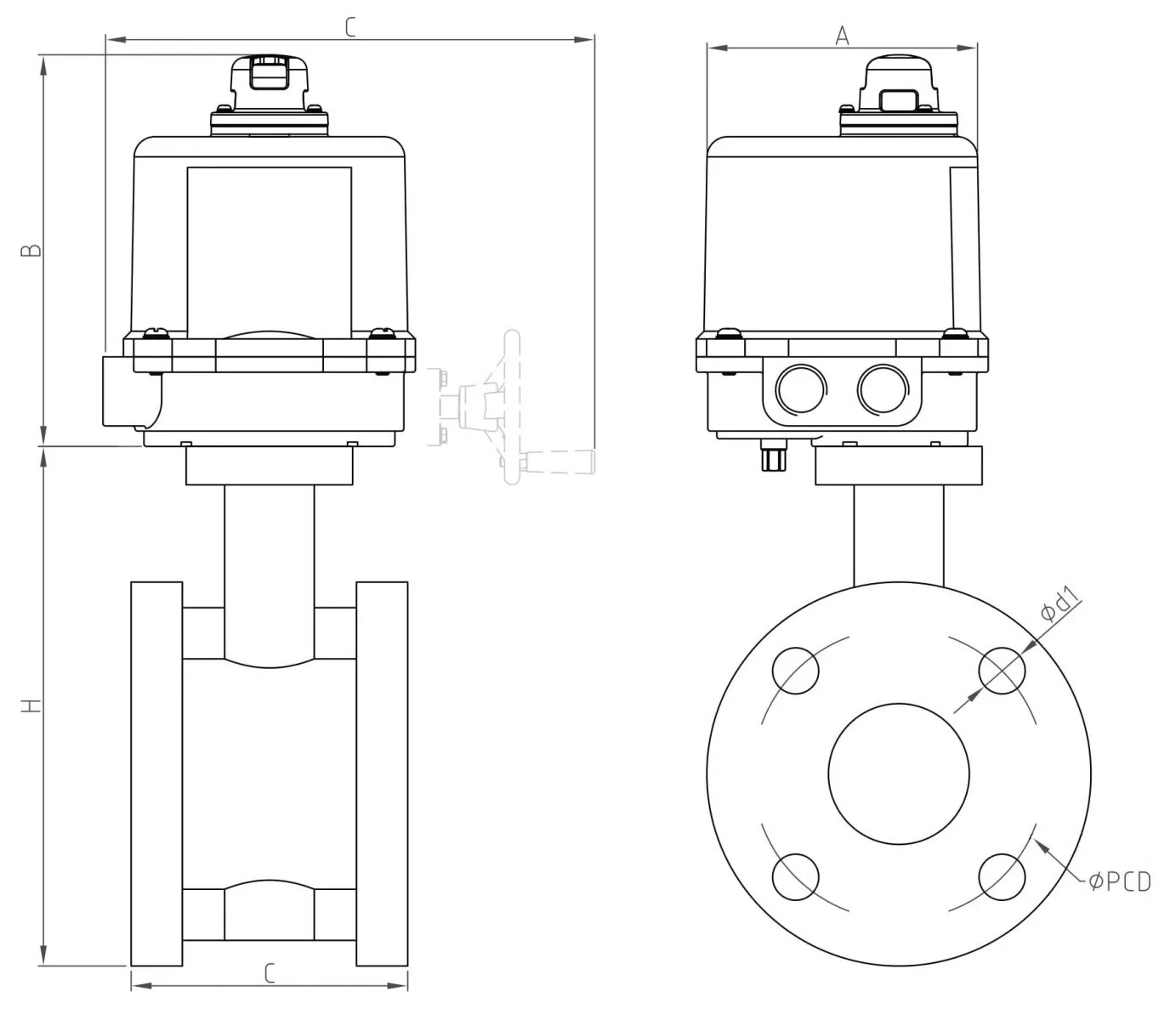 DN | Actuator | C | H | ⌀PCD | n | ⌀d1 | A | B | C |