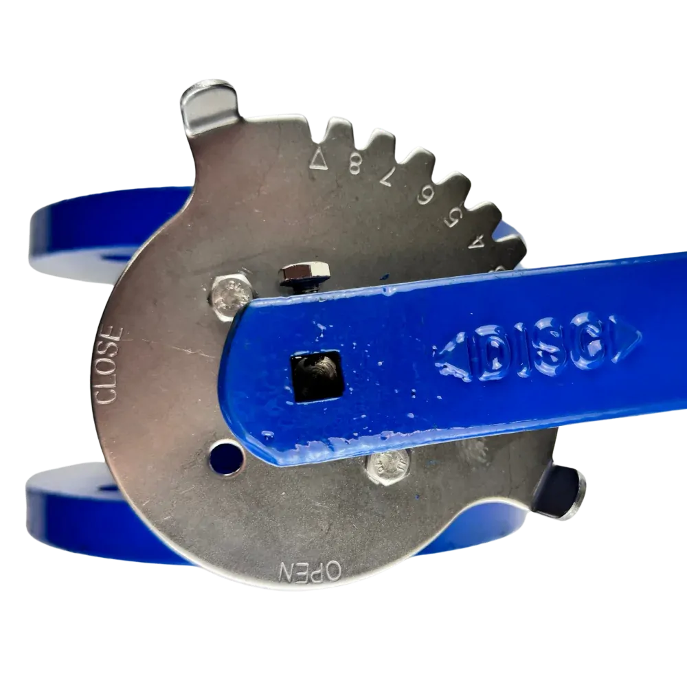 A double flanged butterfly valve works by the shaft rotating 90 degrees which will take the position of the disc in the flow from open to close (or vice versa). When it is closed a seal will be formed between the disc and the seat effectively stopping the flow of the media. When it is opened again the disc comes away from the seat and when it is fully open sits side (smallest surface area facing) on to the direction of the upstream flow. This 90 degree turn will take place from either a lockable handle (has a notch plate to stop at different positions within the 90 degree turn) or a gear box. Both have stops to prevent turning the valve past 90 degrees.