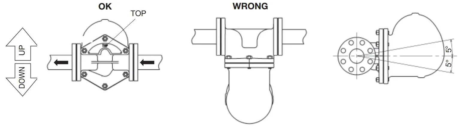 It is recommended to install a strainer at the inlet of the Steam Trap to protect it from any scale or other foreign substances that may enter and impact on the function of the trap.