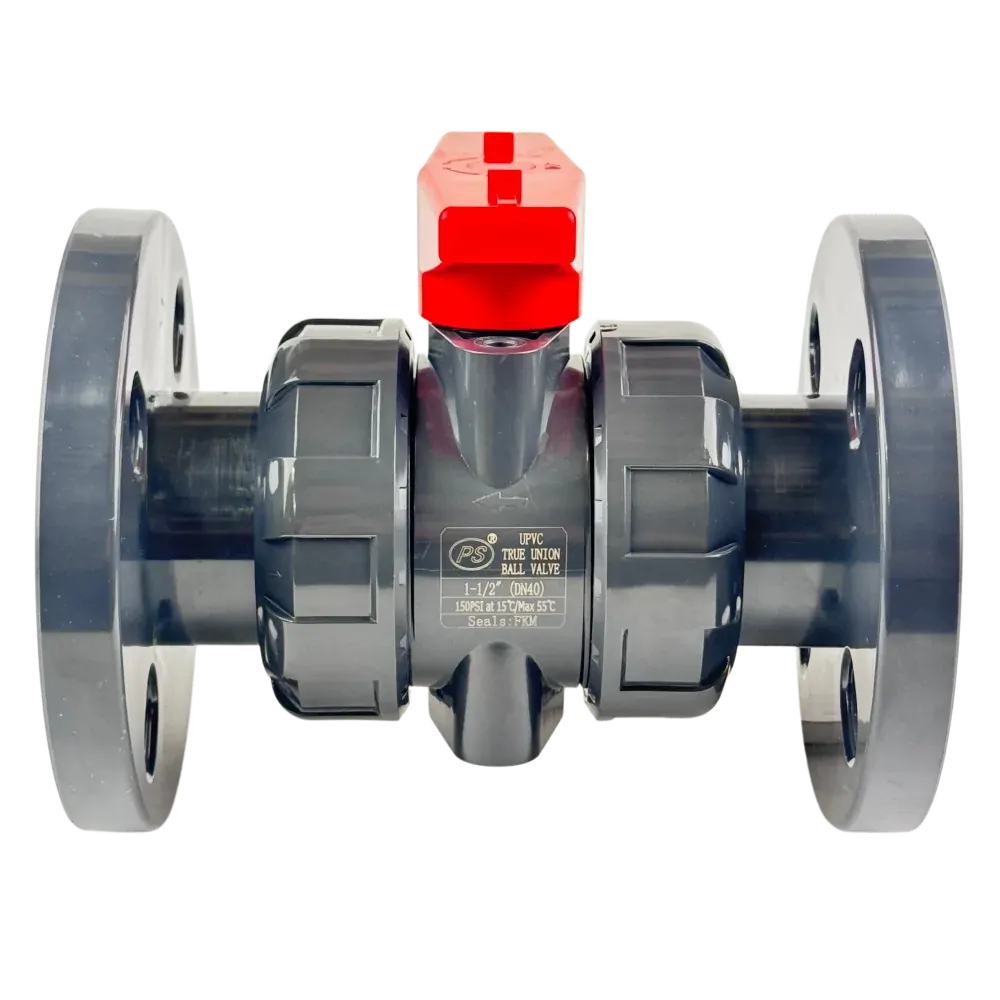 2 way UV stabilised ANSI 150 Flanged PVC true union ball valve. Comes with PTFE (Teflon) seats and our unique double stem seal system (standard in EPDM but also available in Viton). Also features a chem lock insert In the end so the true union can be removed for service work and the ball will not leak when in the closed position. Great PVC ball valve for corrosive or chemical media where traditional material such as brass and stainless steel are not suitable. Commonly used in the aquaculture industry (sea water), chemical dosing, water treatment and pool filtration.
