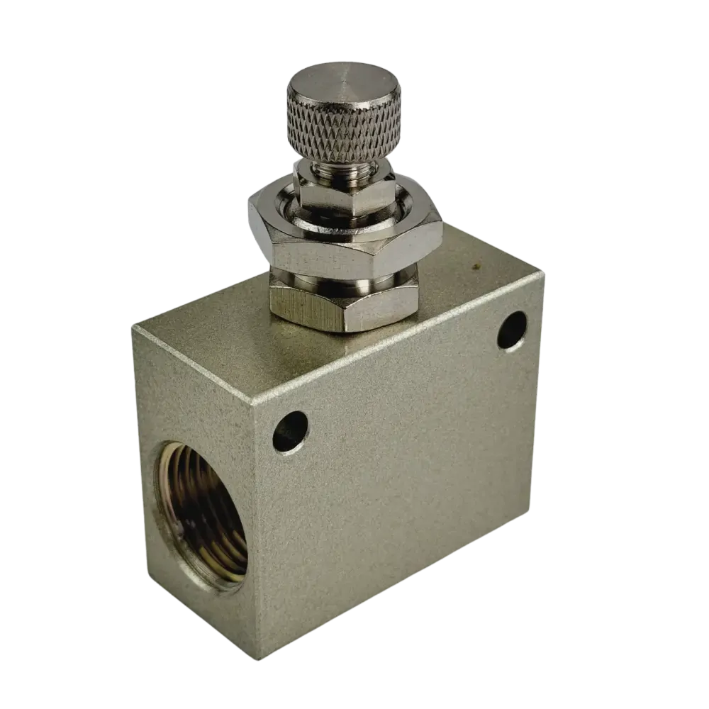 Allows air flow to be precisely controlled in line. Great for controlling air cylinders or actuators by allowing you to set the spped of operation. Always use on the exhause line to avoid stick and slip. Allows full flow of air in one direction (going into actuator) and restriction (set by adjusting needle) on the exhaust.