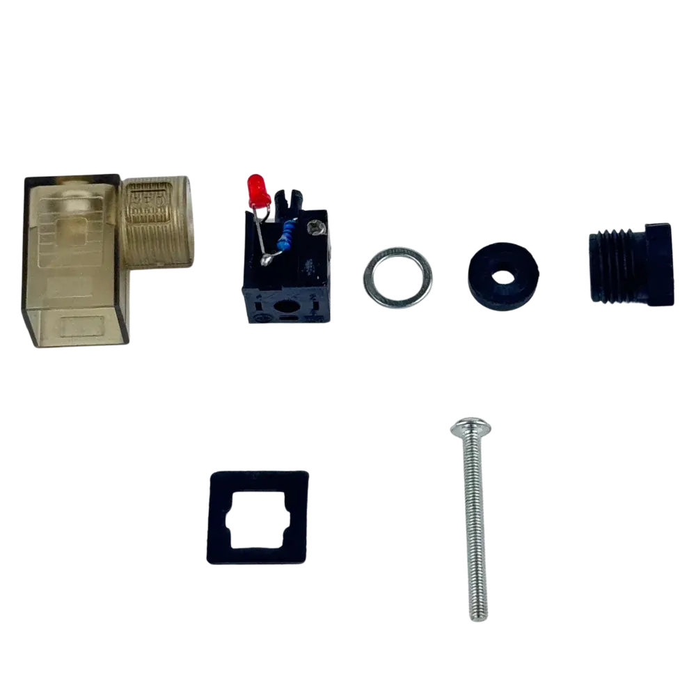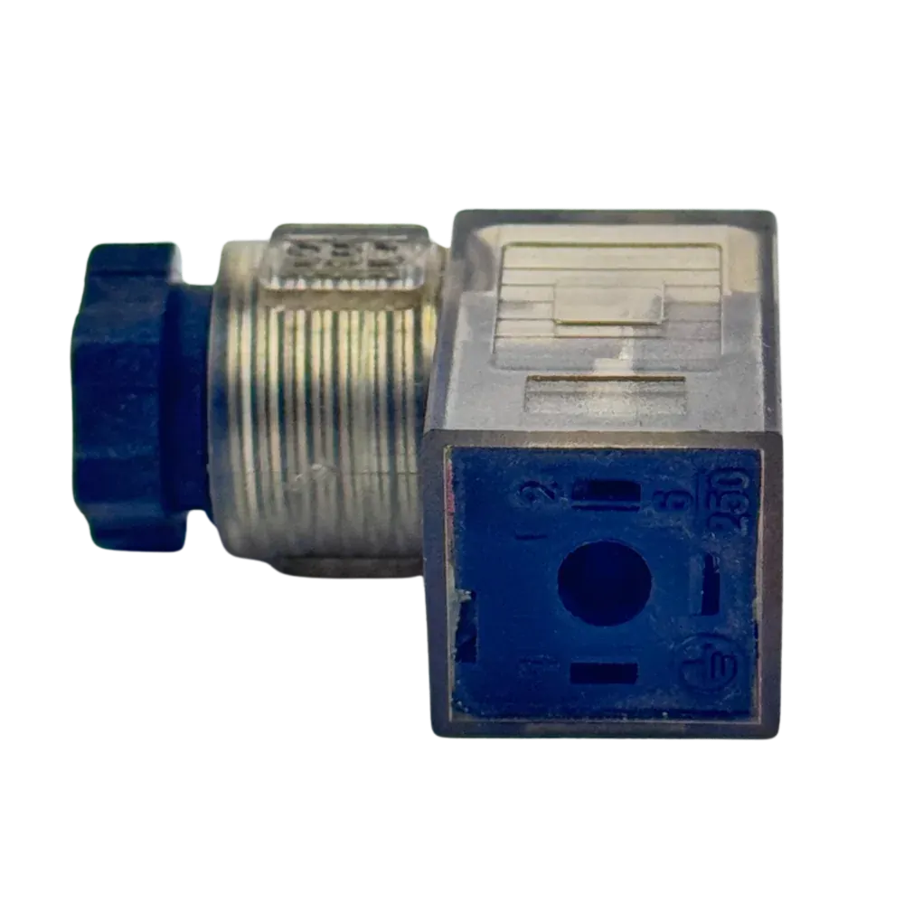 Hirschman type connector DIN 43650 for solenoid valve. Interface between the solenoid coil terminal and the supply wires.