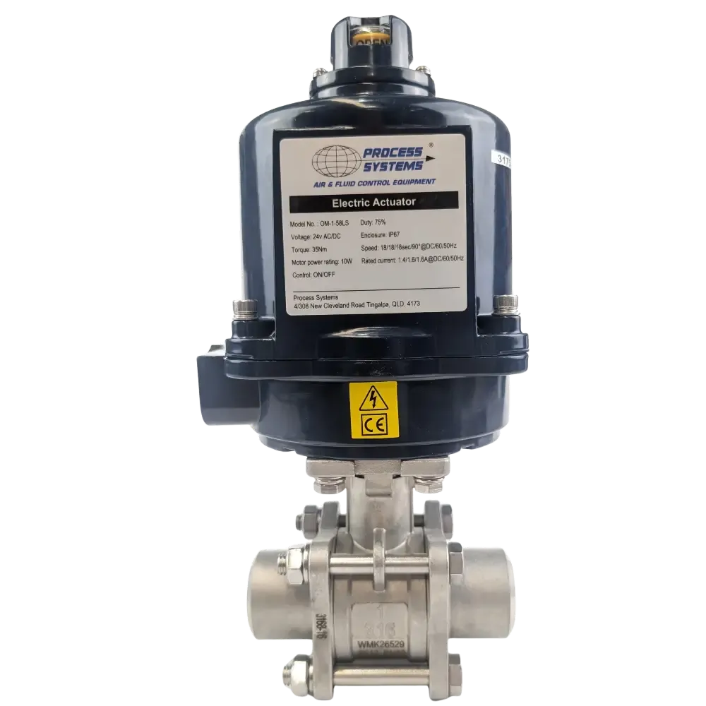 High performance 2 way 316 Stainless Steel ball valve (3 piece) with butt weld connections and a high quality IP67 electric actuator. Self adjusting stem packing assembly with Belleville spring for temperature fluctuations and vibration. Long neck mounting pad to reduce thermal transfer and preserve actuator. Reinforced PTFE seats for temperatures up to 180°C. Electric actuator includes visual indicator, 2 extra limit switches (voltage free) and a manual override. Typical applications include water treatment, chemical, marine, petrochemical and general industry.