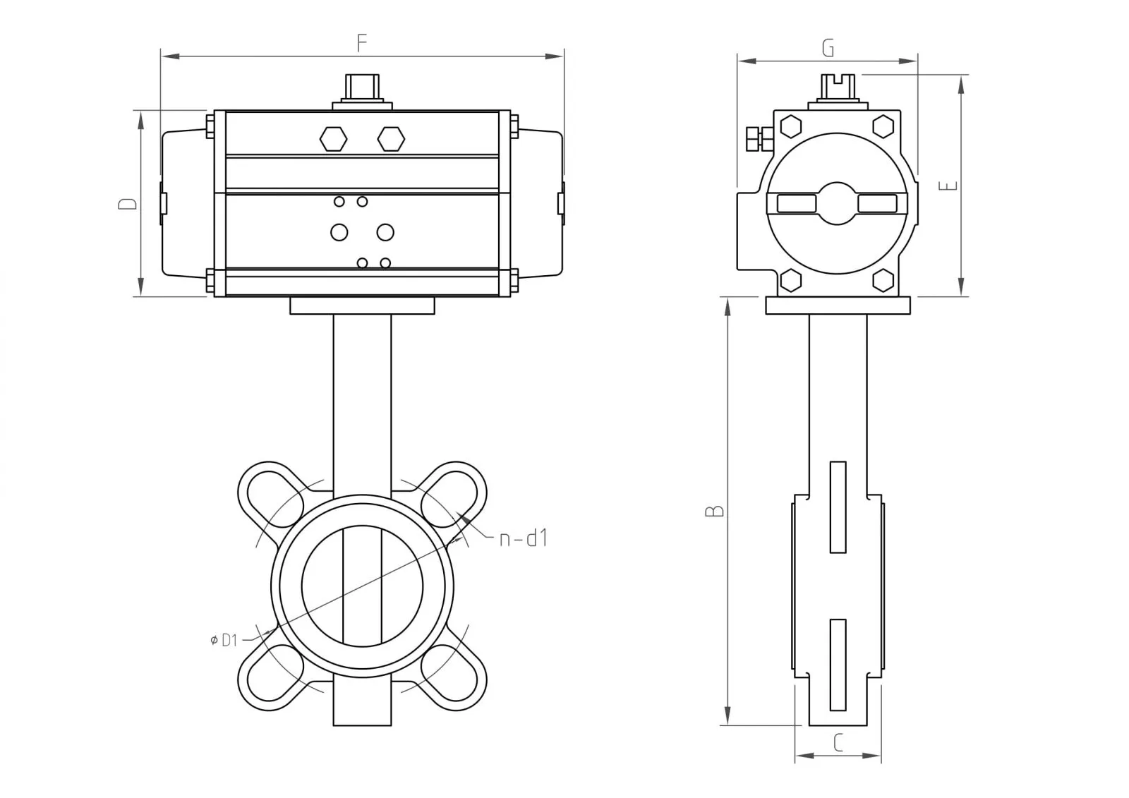 | DN | Actuator | B | C | D | E | F | G | BS4504 PN10 | ANSI 150 | AS2129 Table D | AS2129 Table E | ||||