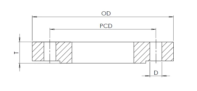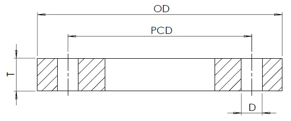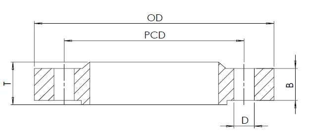 Size O.D PCD Total Thickness (T) Flange Thickness (B) No. of Bolts Bolt Hole Diameter (D)