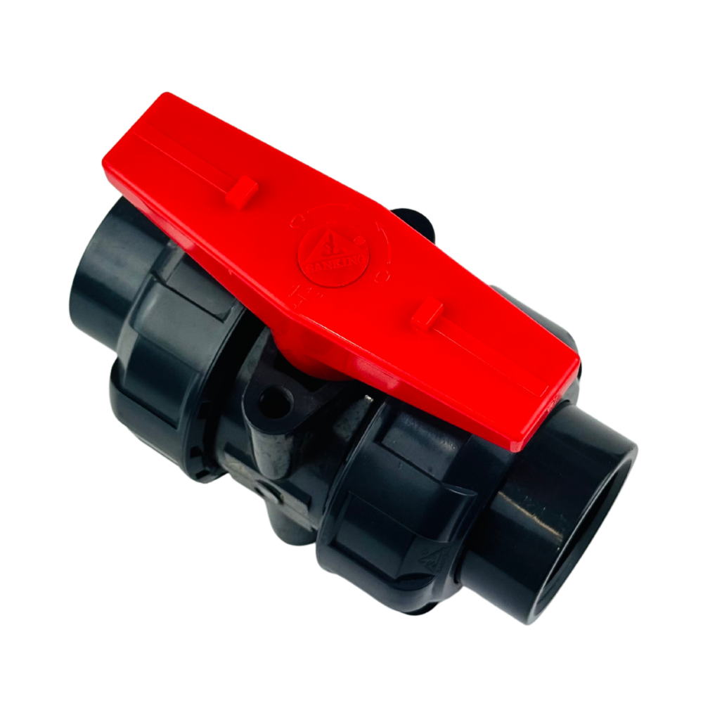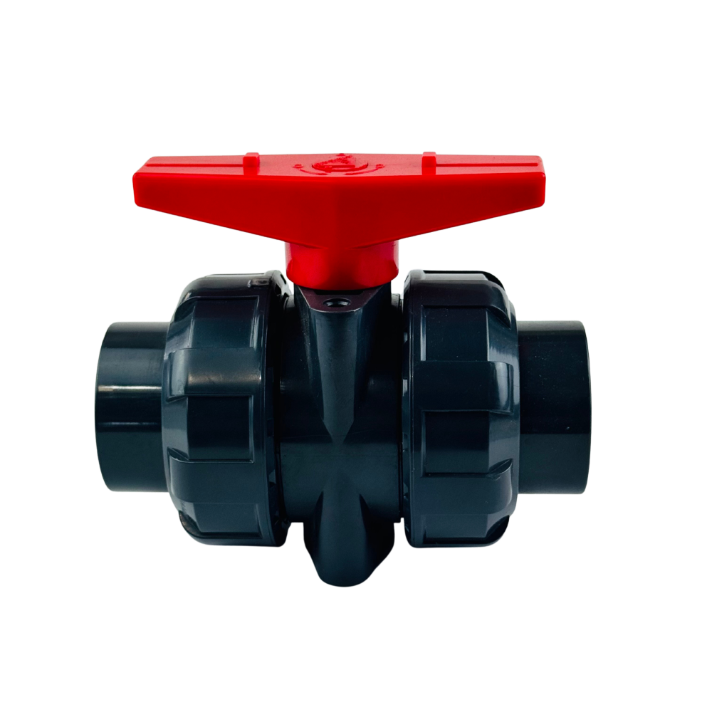 2 way UV stabilised PVC true union ball valve. Comes with PTFE (Teflon) seats and our unique double stem seal system (standard in EPDM but also available in Viton). ). Also features a chem lock insert In the end so the true union can be removed for service work and the ball will not leak when in the closed position. Great PVC ball valve for corrosive or chemical media where traditional material such as brass and stainless steel are not suitable. Commonly used in the aquaculture industry (sea water), chemical dosing, water treatment and pool filtration. Choose between Solvent Weld (ANSI Standard designed to fit Schdule 40 & 80 pipe) and BSP threaded ends (Threads conform to ISO 7.1 Sealing Threads.). Max Temp 60 Deg C.
