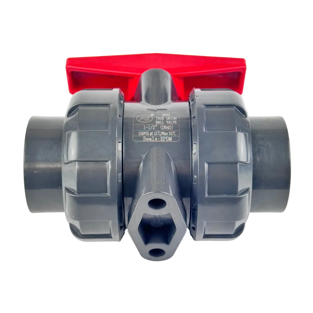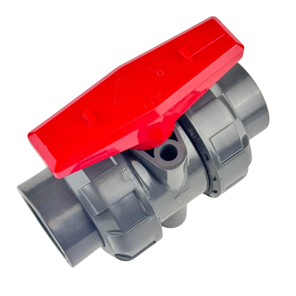 2 way UV stabilised PVC true union ball valve. Comes with PTFE (Teflon) seats and our unique double stem seal system (standard in EPDM but also available in Viton). ). Also features a chem lock insert In the end so the true union can be removed for service work and the ball will not leak when in the closed position. Great PVC ball valve for corrosive or chemical media where traditional material such as brass and stainless steel are not suitable. Commonly used in the aquaculture industry (sea water), chemical dosing, water treatment and pool filtration. Choose between Solvent Weld (ANSI Standard designed to fit Schdule 40 & 80 pipe) and BSP threaded ends (Threads conform to ISO 7.1 Sealing Threads.). Max Temp 60 Deg C.