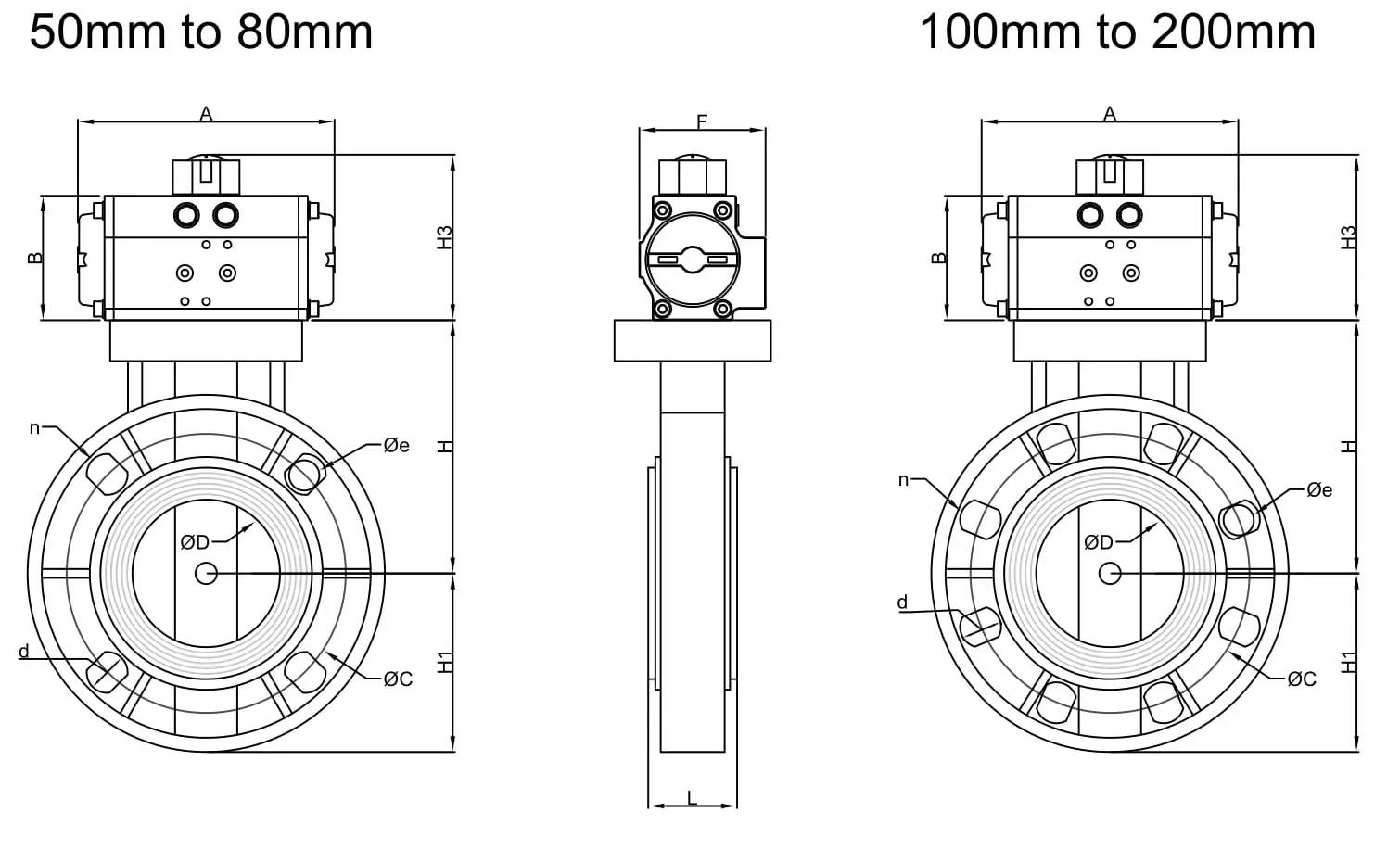 | Size | Actuator | H1 | H | C | L | n | e | D | d | A | B | H3 | F |